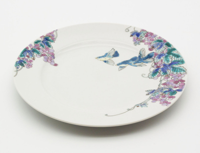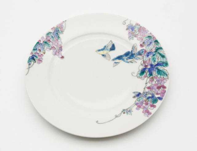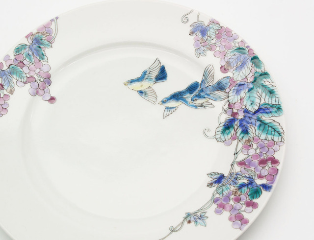 お皿には実が多いことから豊穣・多産・子孫繁栄を意味する葡萄に、羽ばたく鳥を組み合わせました。