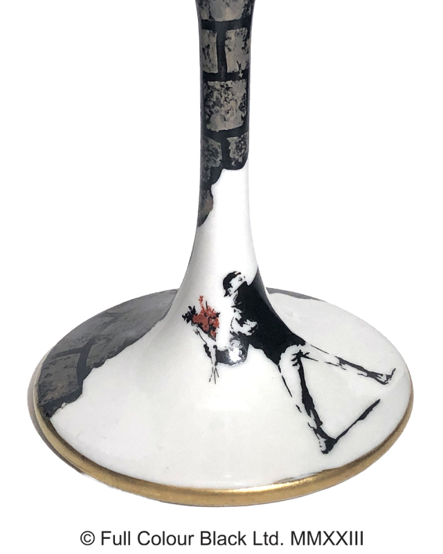 バンクシー作品の中でも特に人気の高い「Flower Bomber」に、九谷焼作家「高聡文氏」の手描きによる銀彩のレンガを組み合わせた意匠となっています。