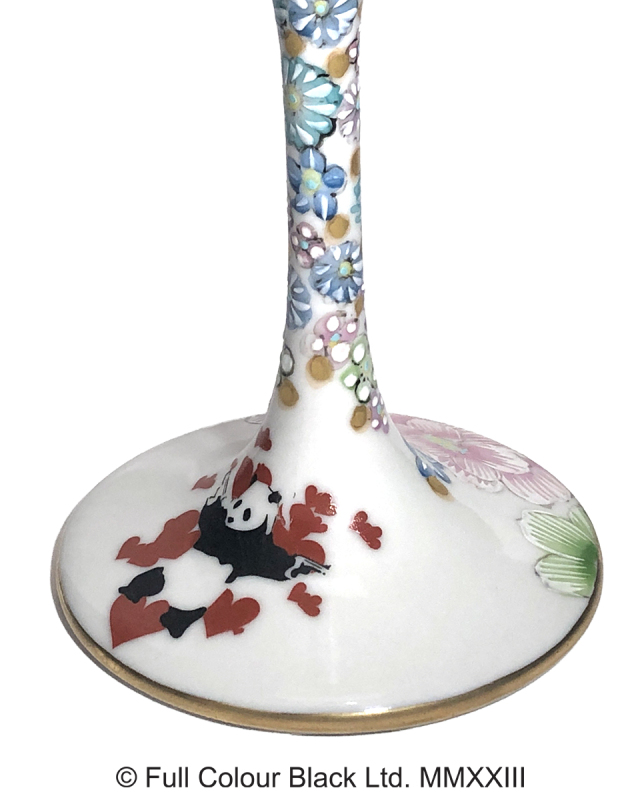 可愛らしいパンダと手にした銃の対比がユーモラスでバンクシーらしい「Panda Gun」に、九谷焼作家「高聡文氏」の手描きによる伝統の花詰模様を配した意匠となっています。