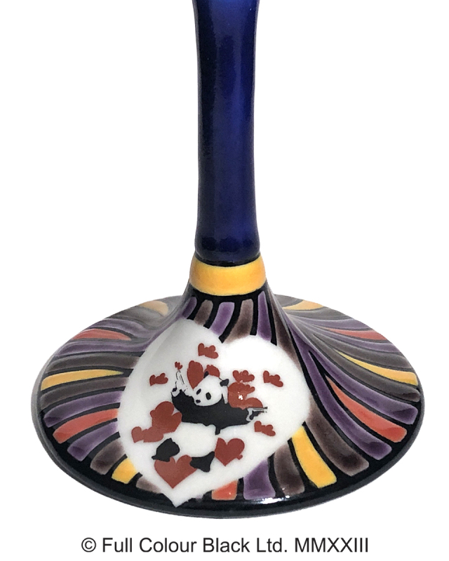 可愛らしいパンダと手にした銃の対比がユーモラスでバンクシーらしい「Panda Gun」に、九谷焼作家「糠川孝之氏」が得意とするステンドグラス風の色絵を合わせた意匠となっています。