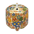 器の表面を四季折々の様々な花で敷き詰め、花の輪郭を金色に描いた意匠が特徴です。