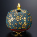 金で描かれた鉄仙文様の隙間を、イッチンと呼ばれる道具を使って青い絵具の粒を落として描かれます。