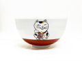 招き猫を思わせる小判と猫、豊作にかけた俵とねずみ、打ち出の小づち、底にはめで鯛が描かれた縁起づくしの飯碗です。