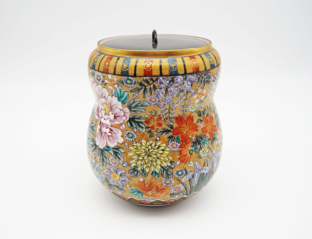 器の表面を四季折々の様々な花で敷き詰め、花の輪郭を金色に描いた意匠が特徴です。