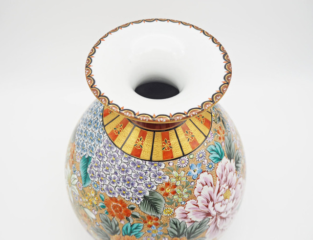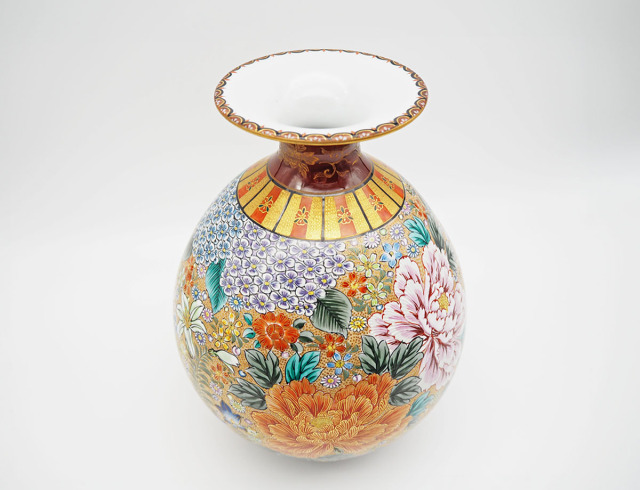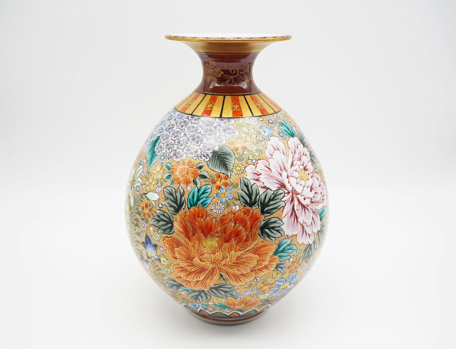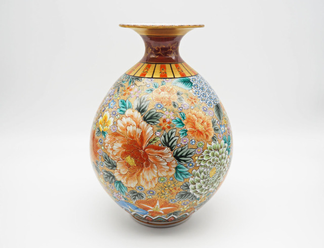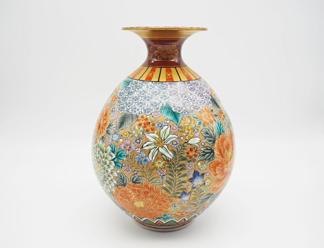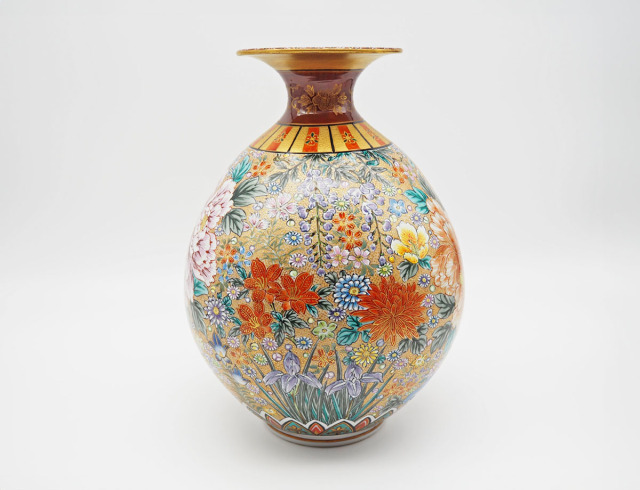 鏑木オリジナル・本金花詰の花瓶です。全面に豪奢な花々が描かれており、どの方向からも目を楽しませてくれる逸品です。
