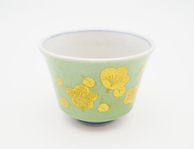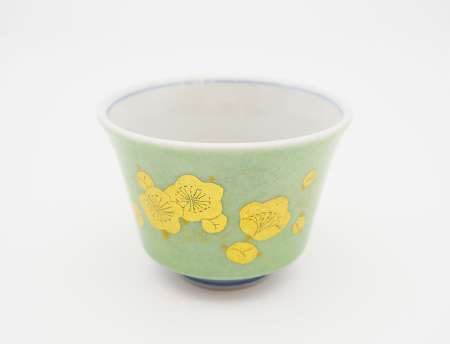 こちらは吉田美統氏の作品です。柔らかな緑色を地色とし、金の梅花が艶やかに描かれています。