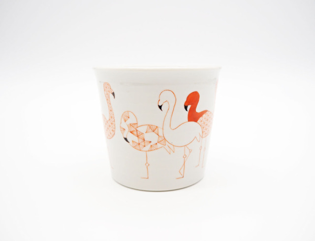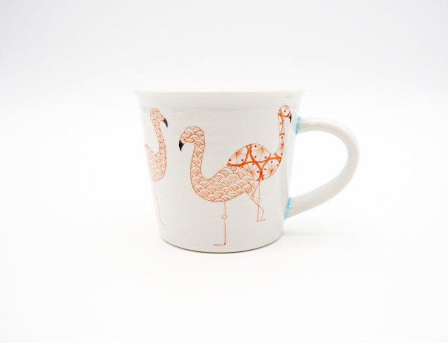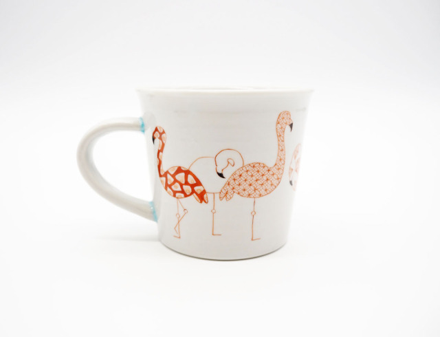 ポップなフラミンゴのシルエットに伝統文様を描いた作品です。
