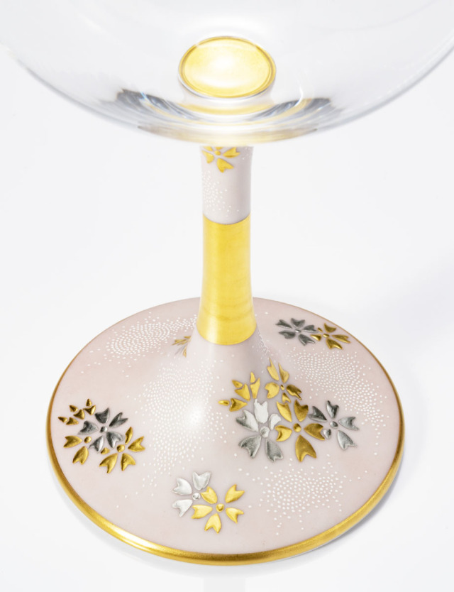 九谷焼の伝統画風「青粒」の名手、三代・仲田錦玉氏による絵付けのワイングラス。