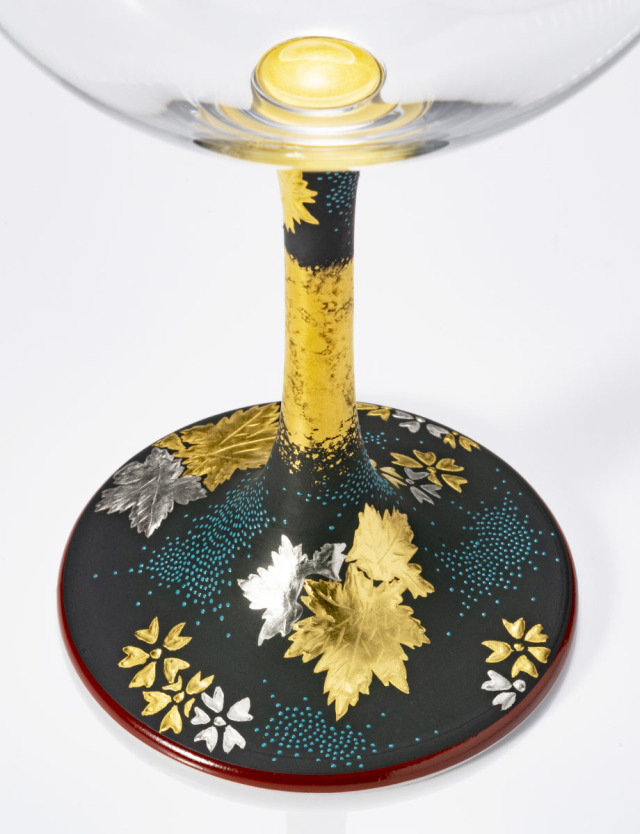 九谷焼の伝統画風「青粒」の名手、三代・仲田錦玉氏による絵付けのワイングラス。