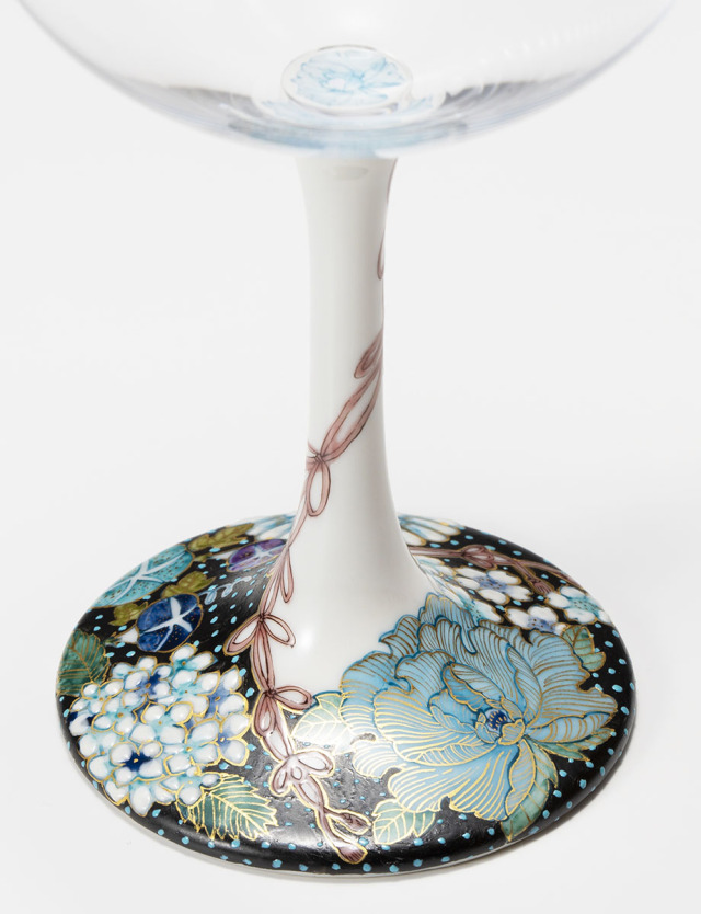 九谷伝統画風を再構築し、繊細に描き出す新進の作家、藤木美里氏による絵付けのワイングラス。