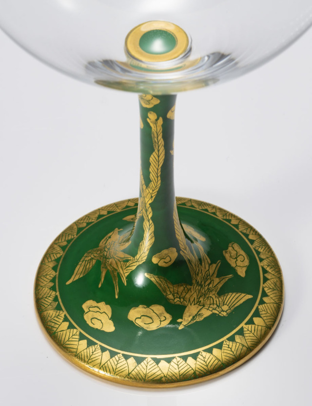 金襴手・花詰などの九谷の伝統様式を伝承する九谷光崖窯三代目、高聡文氏による絵付けのワイングラス。