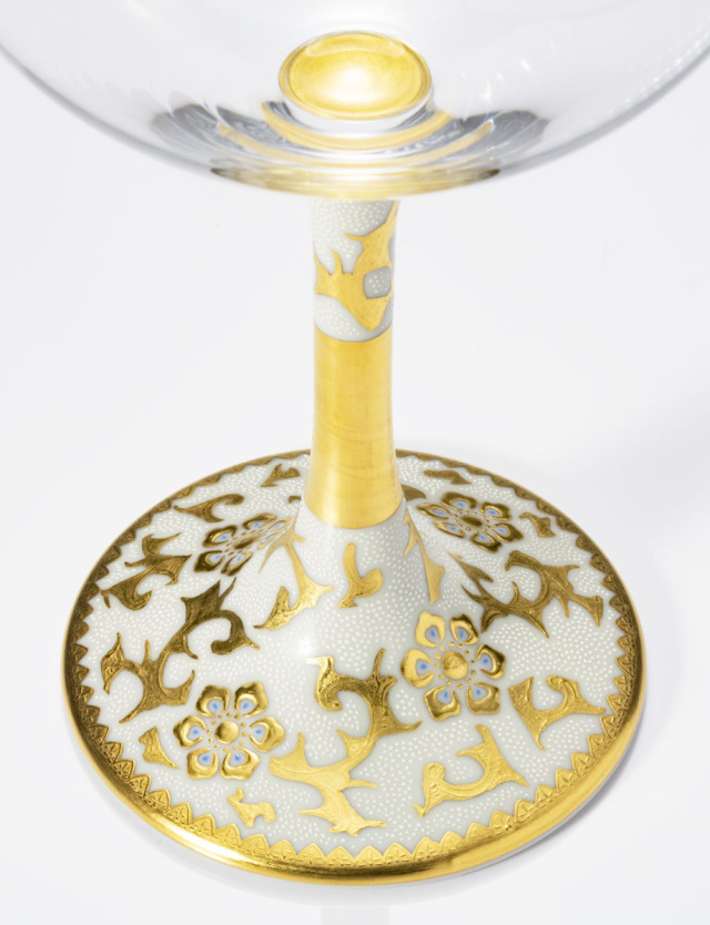 九谷焼の伝統画風「青粒」の名手、三代・仲田錦玉氏による絵付けのワイングラス。