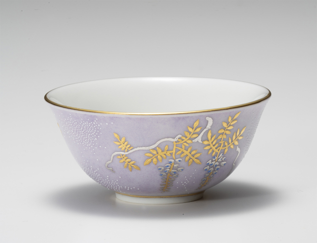 金とプラチナで描かれた豪華な藤の花の間を、余白を活かす形で渦打の白粒が打たれています。