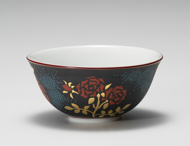 金と赤で描かれた薔薇、その間に配される渦打の粒、薔薇の持つ情熱的で華麗なイメージを存分に表現した逸品です。